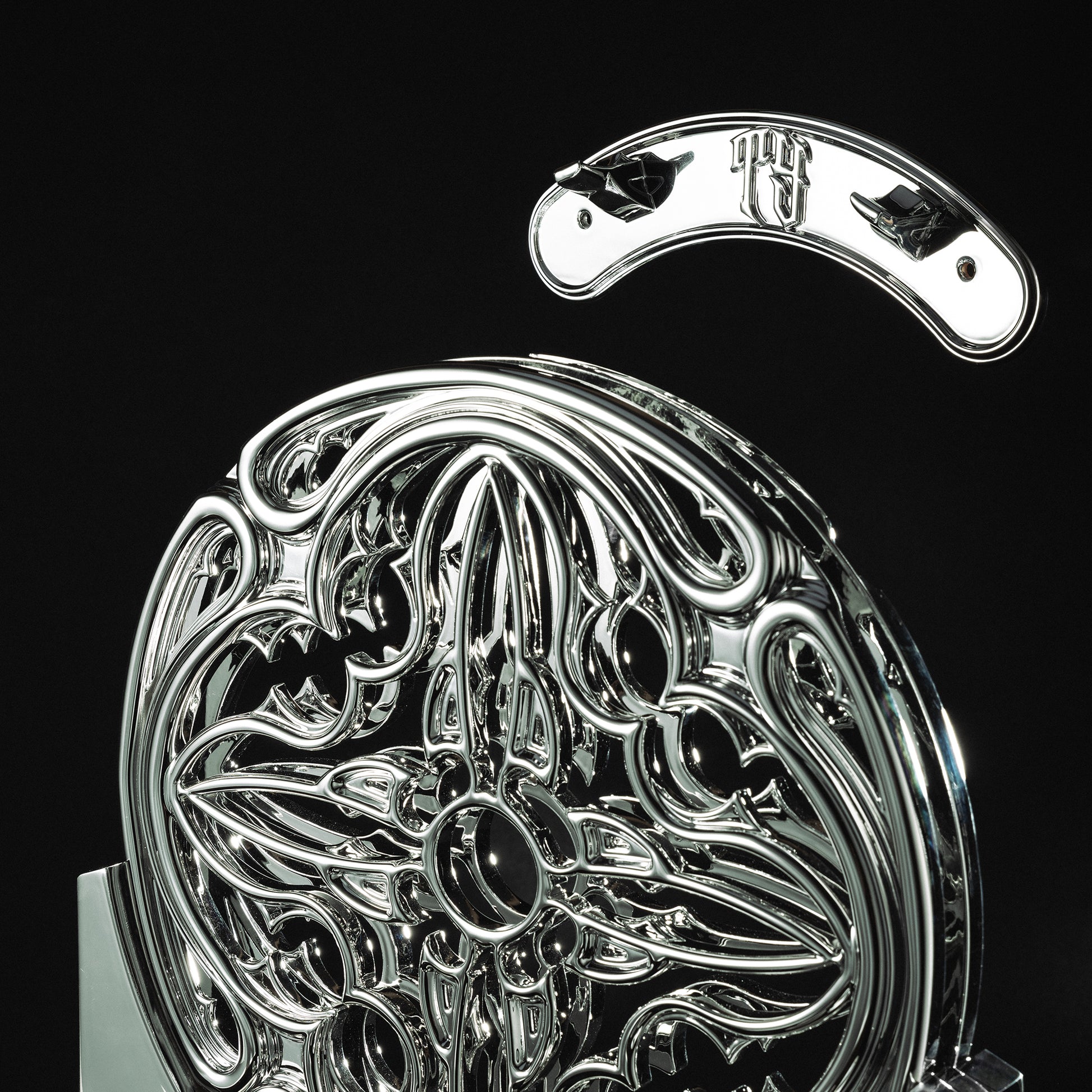The outer shell is constructed with high-durability nylon, precision injection-molded and CNC-machined to form custom components, each hand-polished and plated with JW Color Chart Pale Silver chrome coating for a high-reflective metallic finish. The base has been reinforced to allow the piece to stand on its own, while a laser-engraved edition number is embedded at the lower right corner, affirming its uniqueness.